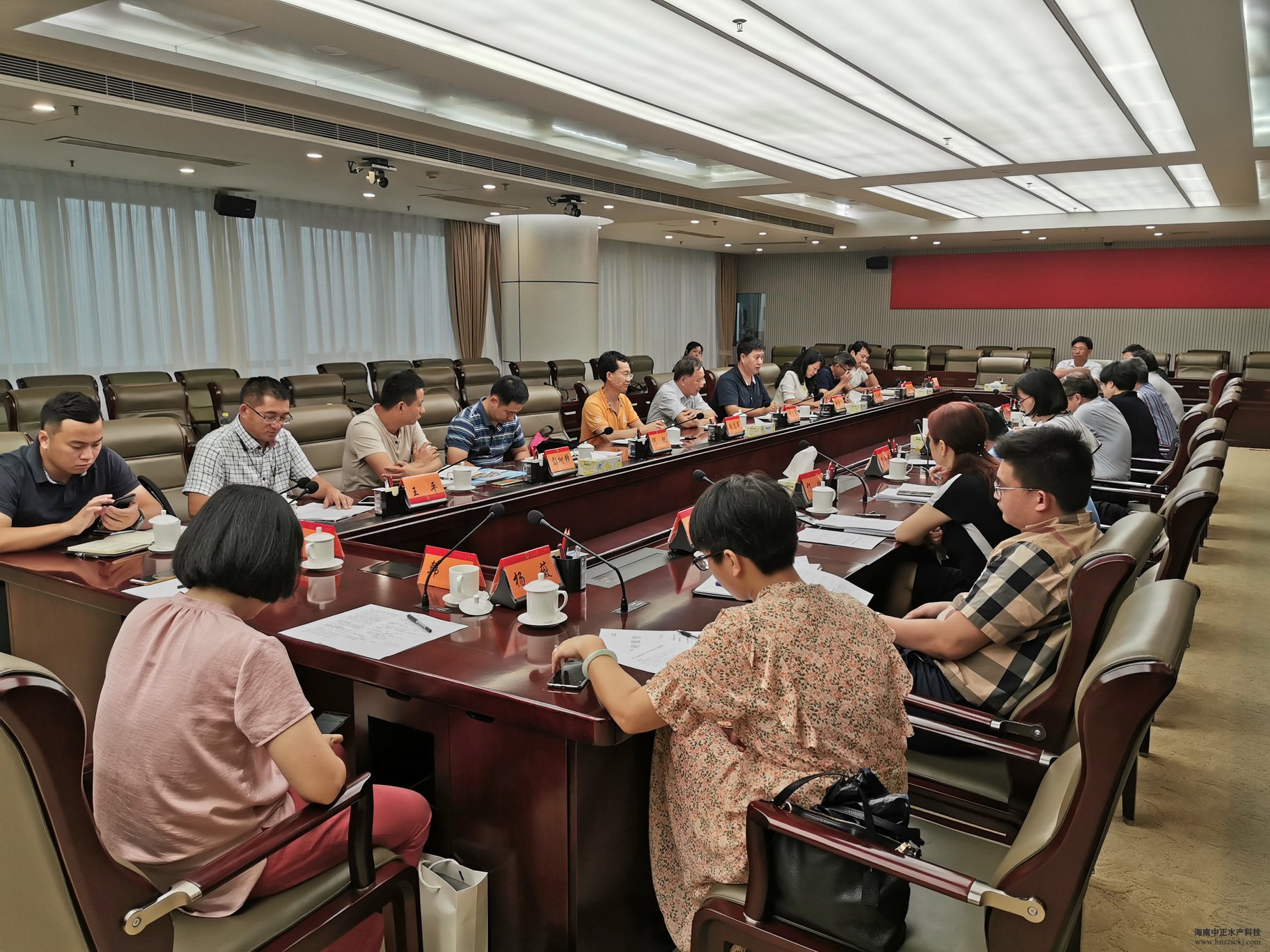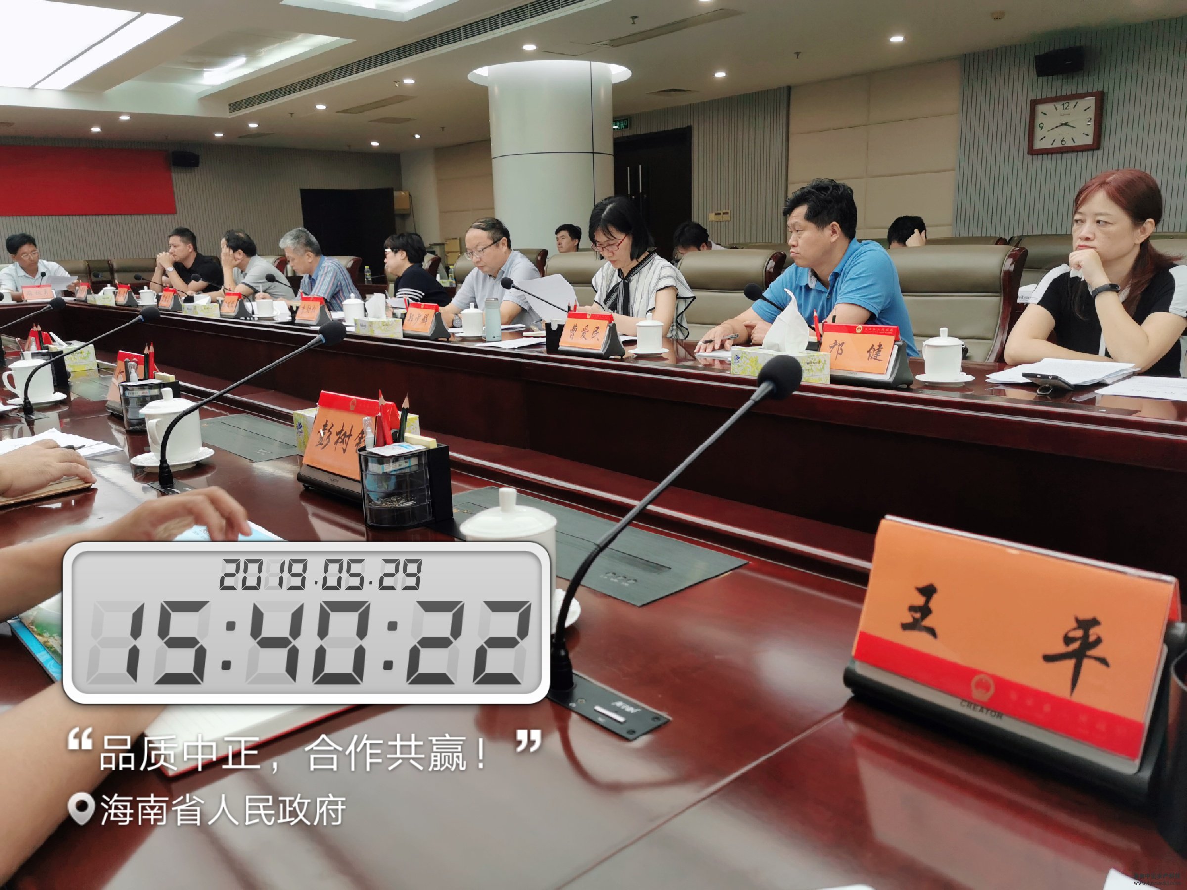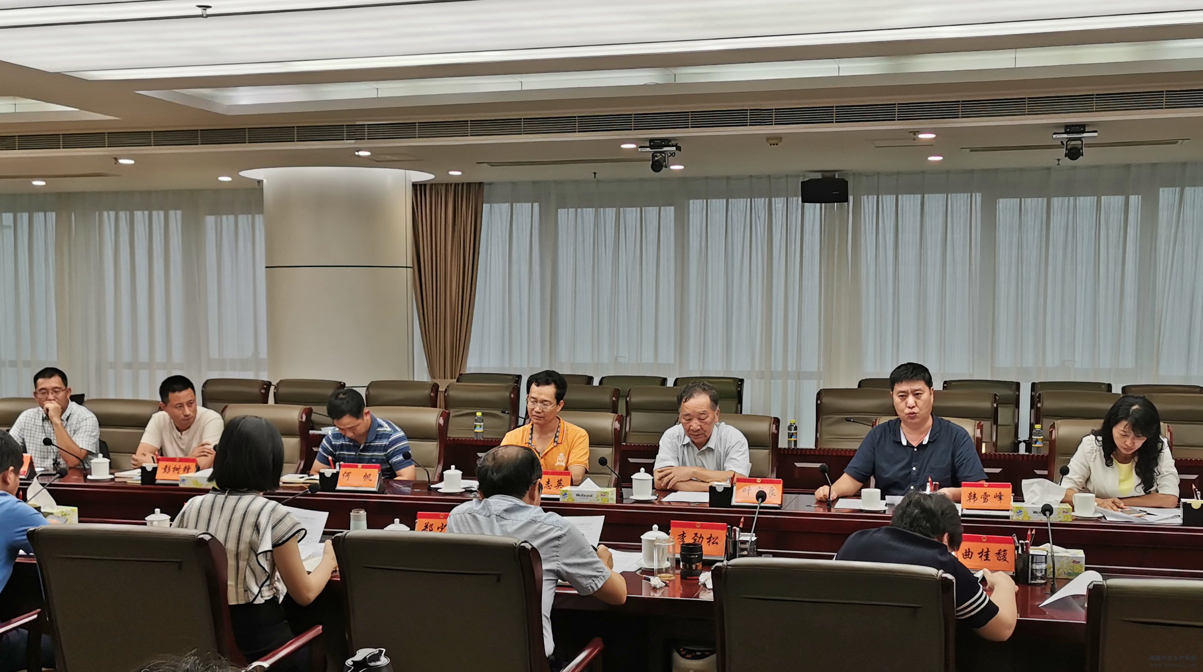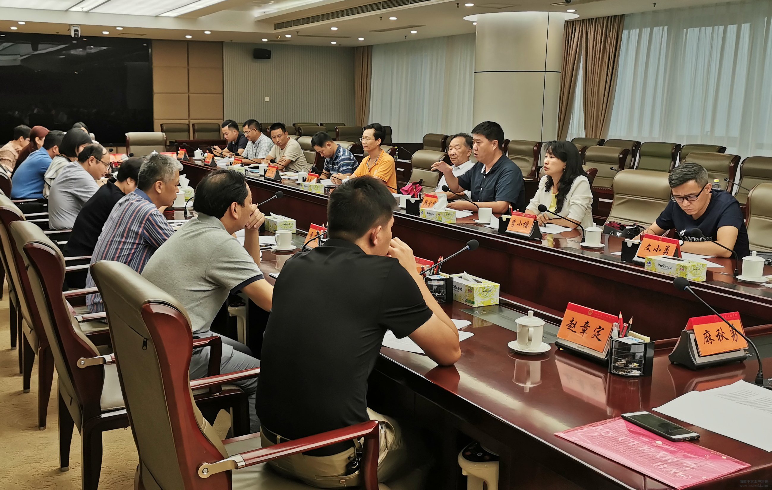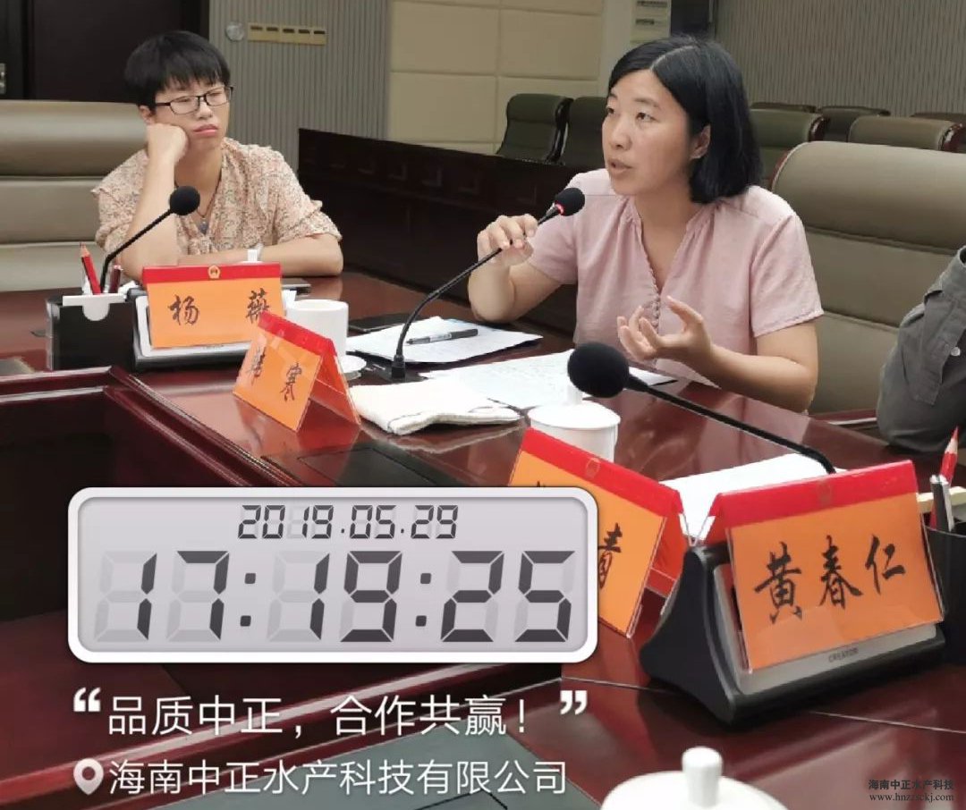 2019年5月29日,海南省省政府副秘书长李劲松受沈晓明省长、刘平治副省长等领导的委托,召集省商务厅、农业农村厅、水产品质量检测中心等相关部门负责人,并邀请我省水产行业企业负责人及行业协会代表,就近期中美贸易摩擦对我省渔业企业的生产与进出口召开专项调研座谈会,共同商讨行业面临的危机与困难以及政府如何为企业提供支持与帮助。同时受邀参加会议的还有广东海洋大学的国务院特殊津贴专家叶富良教授以及中国渔业协会湛江代表处主任、