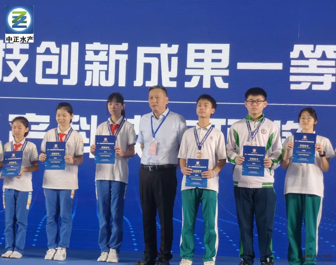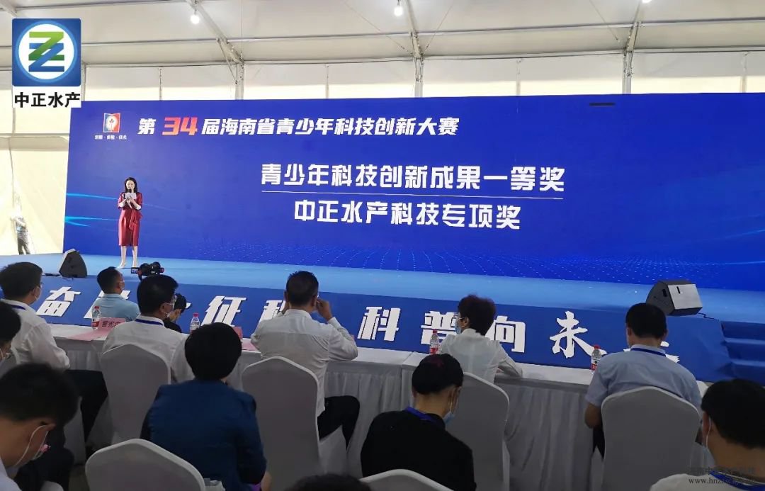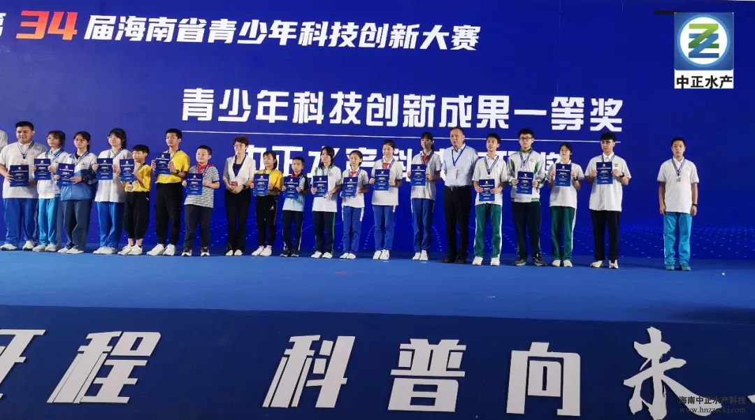 11月20日,在第34届海南省青少年科技创新大赛颁奖活动中,华体官网登录入口网址总裁雷秋凉和海南省科学技术厅副厅长王敏,共同为获奖的同学颁发“中正水产科技专项奖”奖牌和证书,并合影留念。