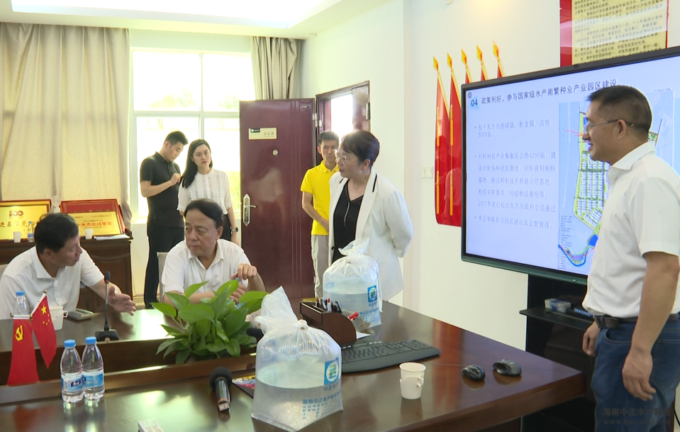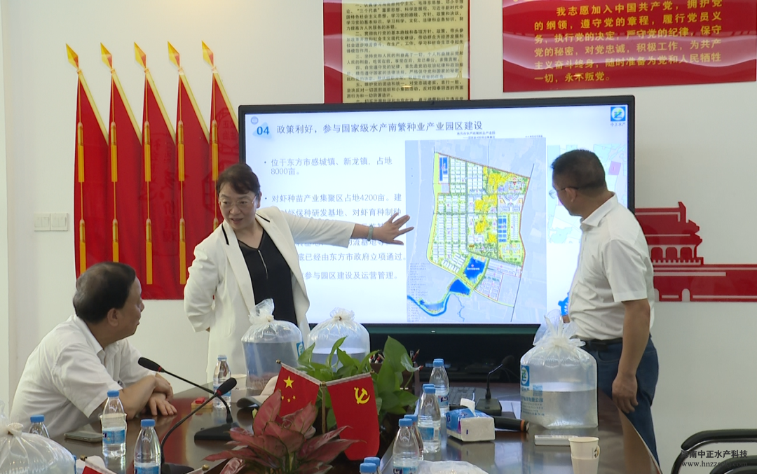 中正水产董事长雷夏雨介绍了公司发展水产种业过程中碰到的困难,也阐述提振水产种业的执着信念;东方市市委书记田丽霞介绍了东方水产南繁种业产业园的建设进度;中正水产副总裁王平从公司标准化生产、生物安保系统构建、对虾育种进程等方面,向考察团汇报了公司的发展历程以及取得的成果。