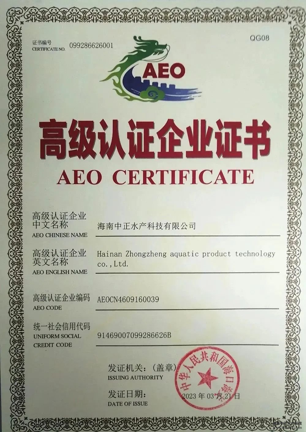 华体官网登录入口网址于2023年3月获批成为海关AEO高級认证企业,成为海南省首家水产种业进出口为主的AEO认证企业。