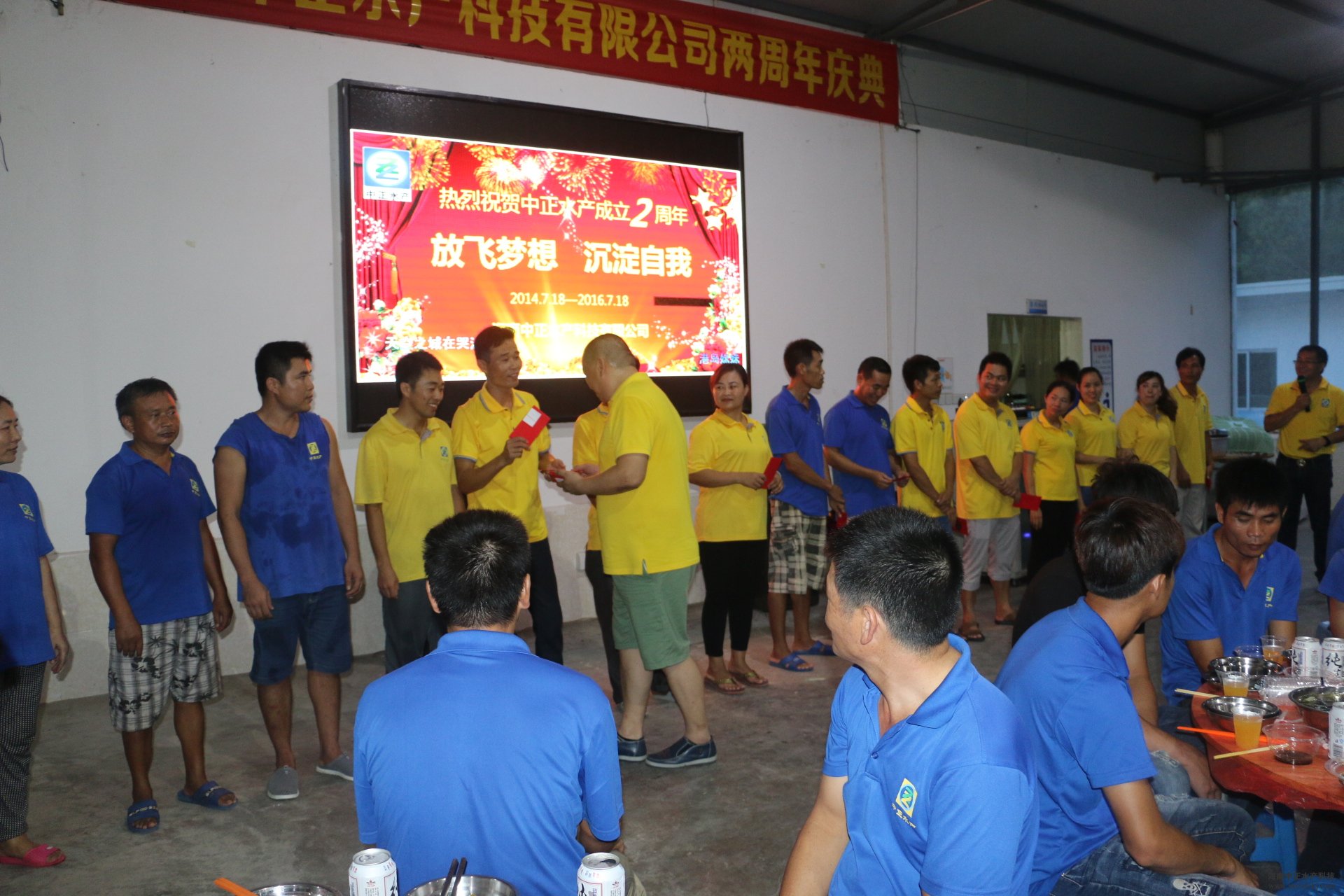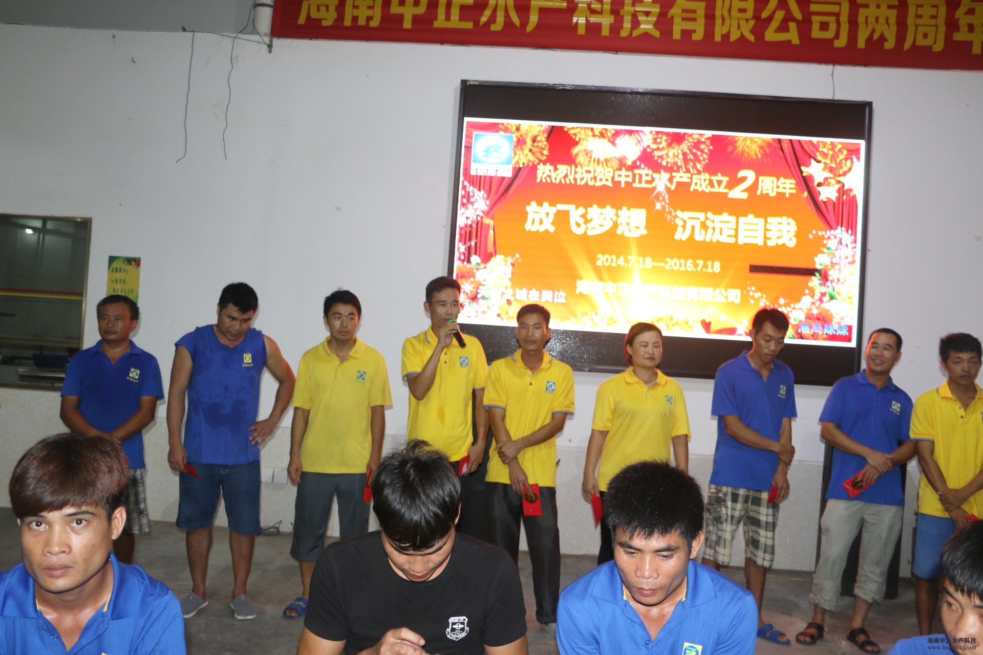 游园活动结束后,公司全体员工共进晚餐。为了感谢一直为公司兢兢业业、辛勤创业的两年老员工,公司给这批老员工奖励了大红包,激励着全体员工向老员工学习,学习老员工辛勤劳动、兢兢业业、拼搏奉献的精神。随后,公司副董事长雷秋凉和总经理王平共切蛋糕,公司全体员工唱生日歌,庆祝中正水产成立两周年。