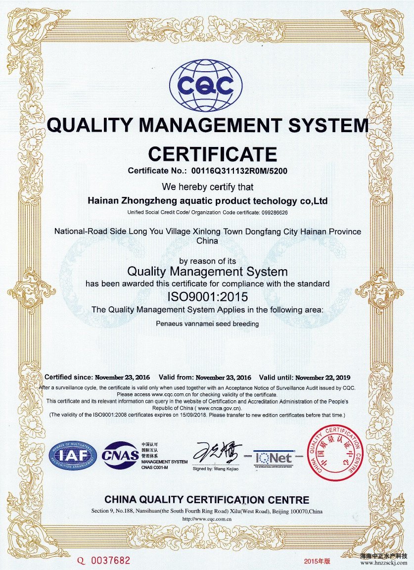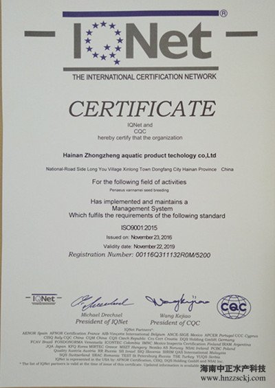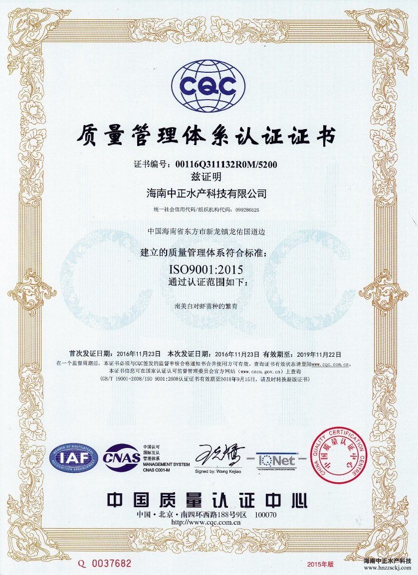 华体官网登录入口网址,继先后荣获中国南美白对虾苗“新锐企业”和“2016中国水产行业十大健康安全种苗品牌”称号后,于2016年12月,又顺利通过了ISO9001:2015国际标准化质量管理体系认证和国际认证联盟(IQNet)质量认证。