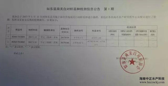 为确保养殖户利益,保证如东虾苗品质,如东县南美白对虾协会与江苏省海洋研究所联合建立的虾苗检测平台也同期启动,并对中正水产的两批南美白对虾虾苗进行了WSSV、IHHNV、EMS、EHP等4项指标的检测。检测结果均为合格,四项指标正常!